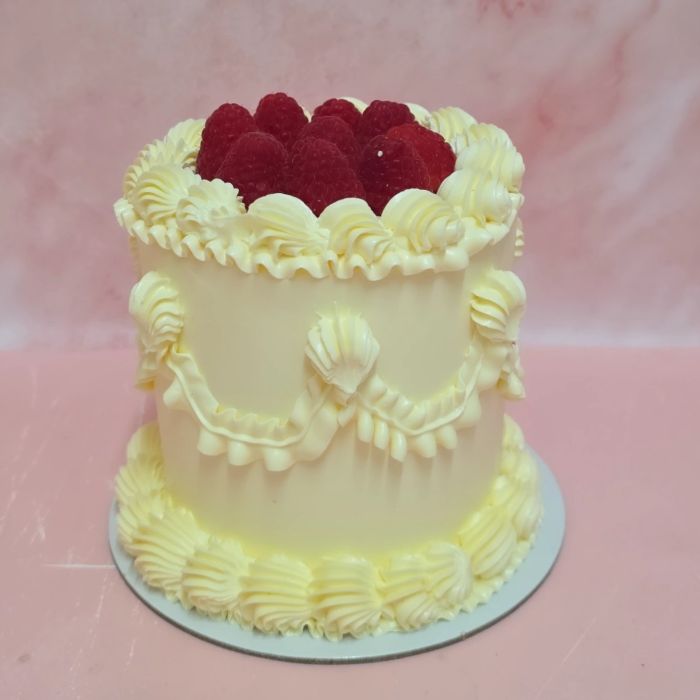 Raspberries & Cream Tall and Tiny is the sweetest little celebration cake. Perfect for 2-6 people. Our signiture vanilla raspberry cake filled with raspberry jam & mascapone cream filling. Beautifully decorated with vintage piping and topped with fresh raspberries.